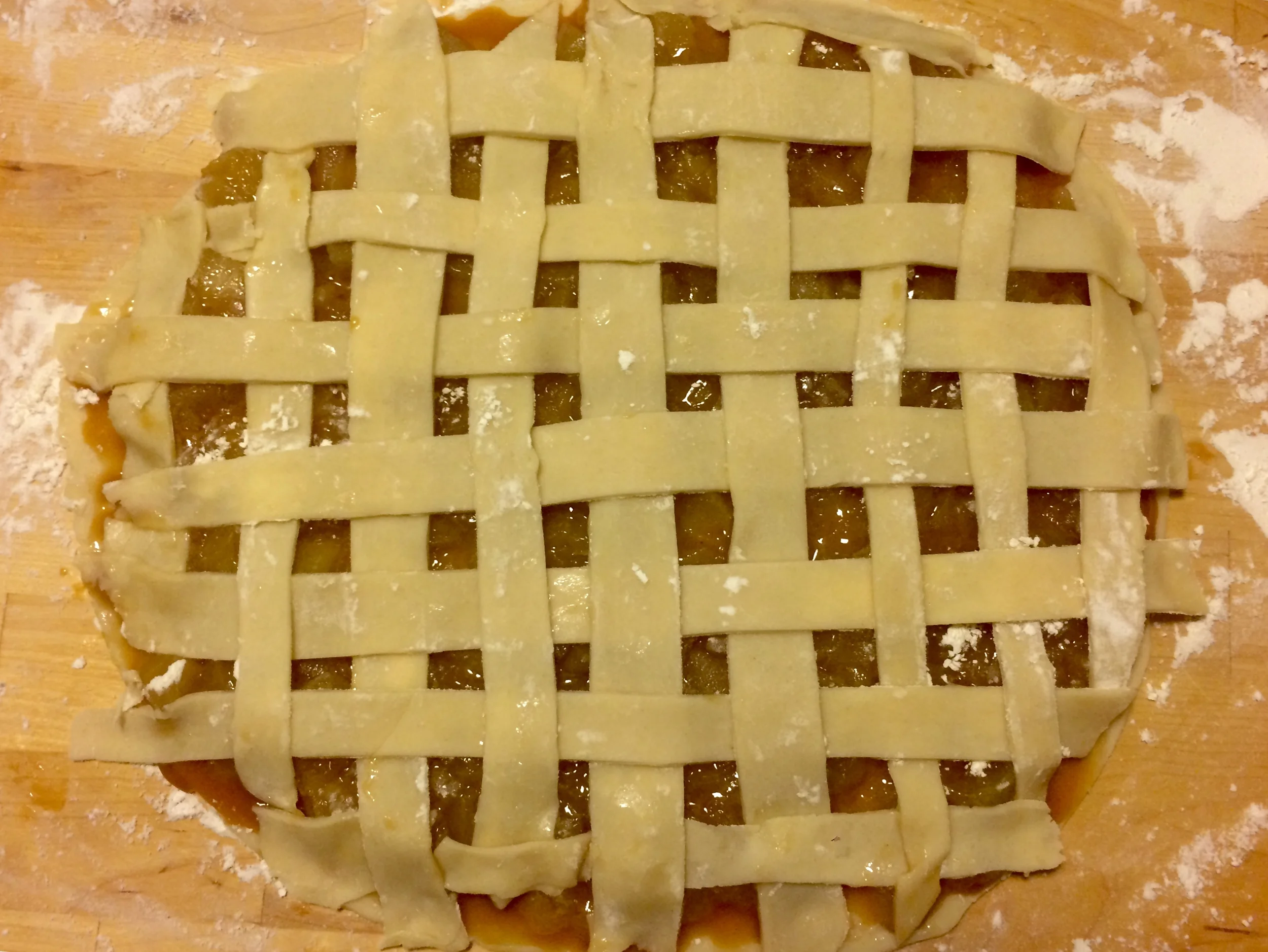 Roll out another sheet of pie crust and use a knife to slice it into thin strips for the lattice topping. Lay the strips onto the other crust with the caramel and filling to create a lattice top, just like a pie!